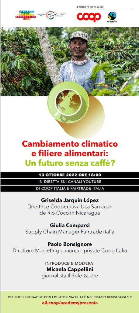 L’appuntamento con “Cambiamento climatico e filiere alimentari: un futuro senza caffè?” è fissato per giovedì 12 ottobre alle ore 18. All’incontro parteciperanno Griselda Jarquín López, direttrice Cooperativa Uca San Juan de Rio Coco del Nicaragua; Giulia Camparsi, Supply Chain Manager Fairtrade Italia, e Paolo Bonsignore direttore Marketing e marche private di Coop Italia. A moderare il confronto sarà la giornalista Micaela Cappellini della testata Il Sole 24 Ore.