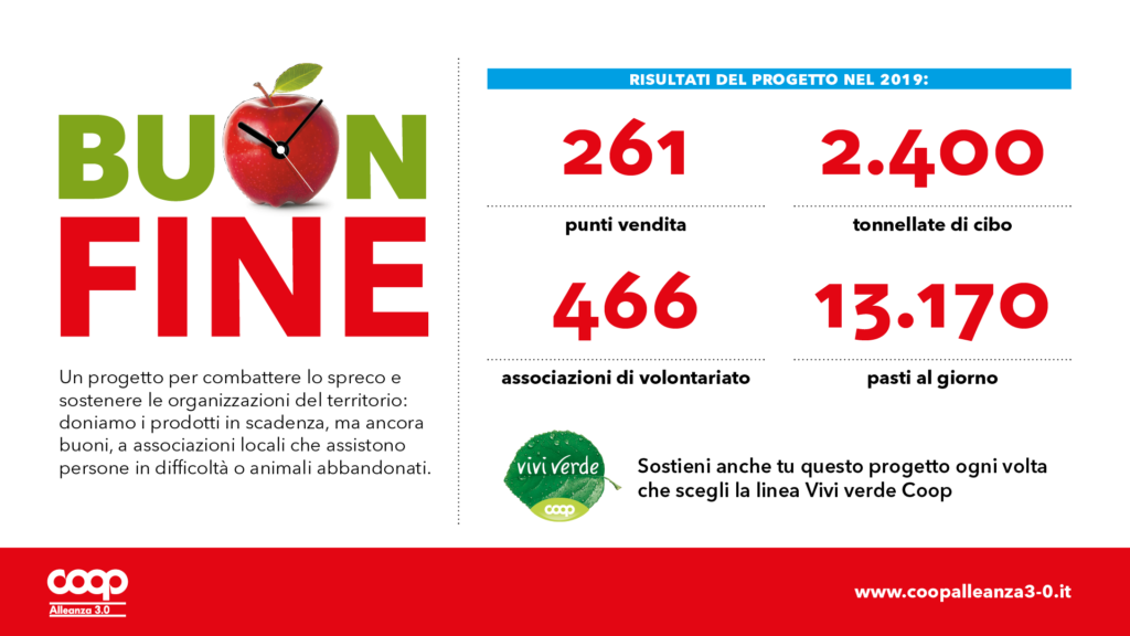 Nell’area dedicata dei negozi della Cooperativa i prodotti Buon fine, vicini alla scadenza o con piccoli difetti, sono disponibili con sconti dal 30 al 50%: sono prodotti ancora buoni e salubri che costano meno. Acquistarli significa fare una spesa intelligente che fa risparmiare e riduce anche l’impatto ambientale. I prodotti scontati invenduti, sono poi donati alle centinaia di associazioni che si occupano di persone svantaggiate o a strutture per animali abbandonati, individuate grazie alla collaborazione con istituzioni e volontari della Cooperativa, garantendo il completo rispetto delle normative igienico sanitarie di riferimento. E compiendo il ciclo virtuoso.
