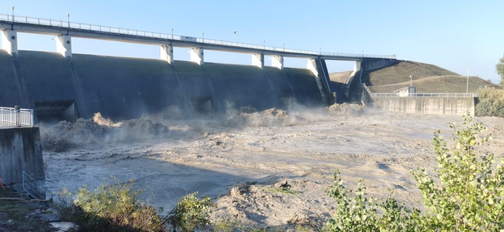 Impressionanti le immagini che vi mostriamo: siamo dietro al parco Enza a Montecchio. Eravamo abituati a vedere il torrente qui con pochissima acqua dalla primavera scorsa, Aipo stava svolgendo lavori di manutenzione del pettine e del manufatto in cemento della cassa d’espansione ma ha dovuto sospendere tutto. La portata del torrente questa mattina era impetuosa e la cassa d’espansione si è riempita.